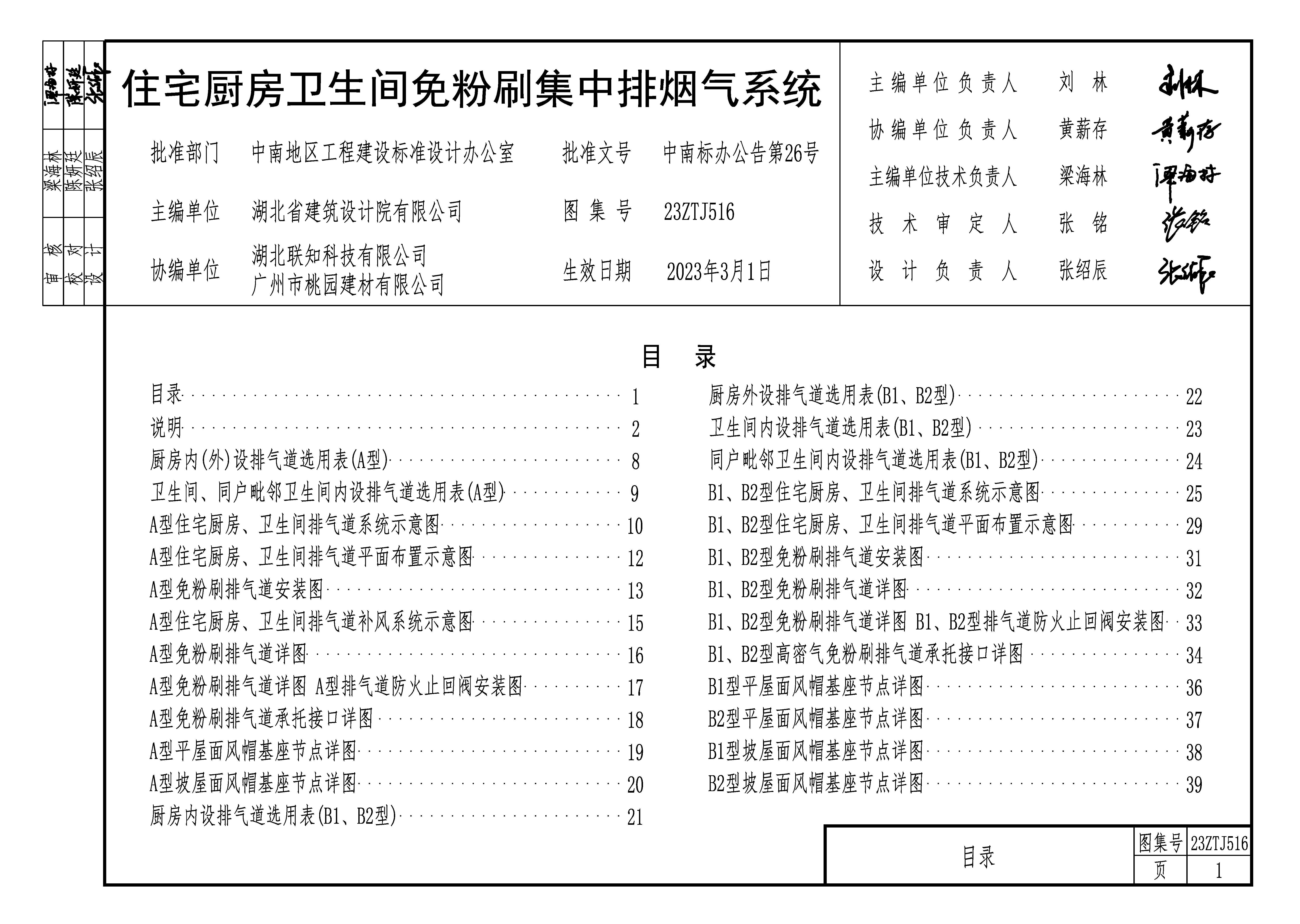 2.2本圖集提供了住宅廚房衛生間A型、B1型、B2型高密氣免粉刷排煙氣系統的承托接口詳圖、防火止回閥安裝詳圖、屋頂防倒灌風帽的安裝節點詳圖等。