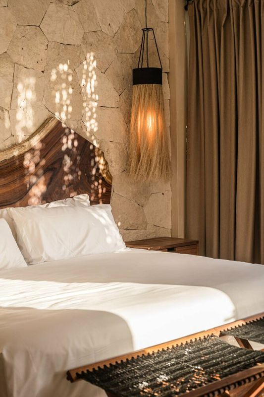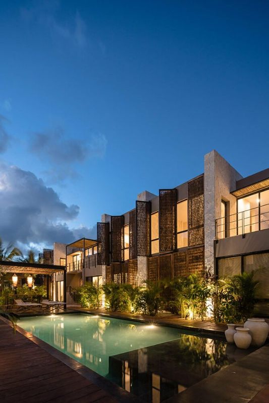 這個外墻是由巨大的、可操作的百葉窗組成的,可以根據居住者的需要折疊打開或關閉。這是一種內在的狀態的表達,表達了使用者的當時的情況。除了當地的藤蔓植物,該團隊還利用了該地區的各種材料。這些材料包括藤條、“瑪雅景觀采石場”、Chukum灰泥和Parota木材。該團隊繼續說:“它的設計、材料的選擇、色調和植被尋求產生一個平靜和和平的空間。該項目探索了內部和外部、社區和私人空間的持續關系,照顧到了與周圍環境的輕松和尊重的氛圍”。