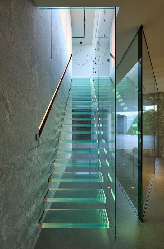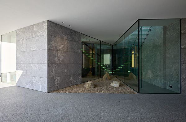 河邊看,建筑師把臥室放在右邊的部分;中間是帶廚房的客廳,左邊是娛樂室。同樣值得注意的是,在一層樓高的房頂上放置了一個釉面矩形盒子。它像一個潛望鏡,可以俯瞰周圍的樹冠。房子有兩個游泳池,包括一個室內(nèi)游泳池和兩個外部泳池,還有一個300米長的跑道和一個可以與山腳自由交流的移動平臺。房屋有多種自動化設(shè)備,再加上創(chuàng)新的技術(shù)解決方案,保證房屋的舒適度。