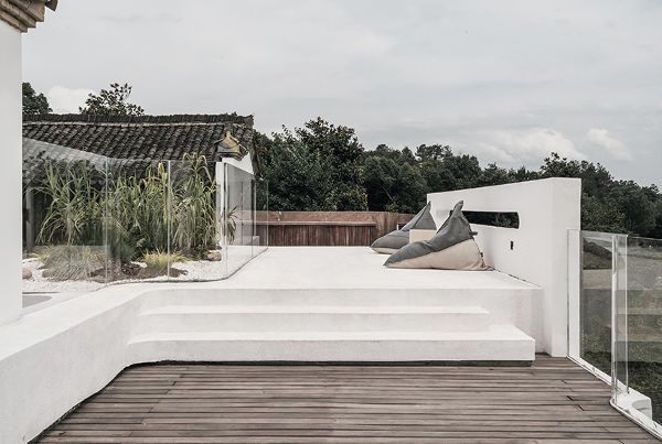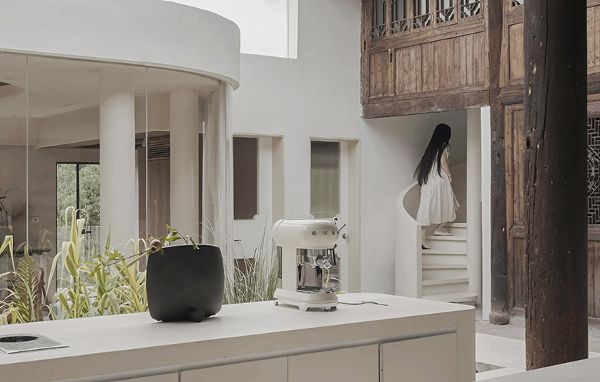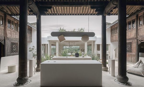 保持中國(guó)文化特色,木質(zhì)結(jié)構(gòu)被保留下來,以現(xiàn)代的形狀來支持基礎(chǔ)設(shè)施。極簡(jiǎn)的幾何形狀補(bǔ)充了傳統(tǒng)設(shè)計(jì),形成了新的休閑和茶會(huì)空間。充分展示傳統(tǒng)風(fēng)格建筑,建筑師增加了現(xiàn)代家具,以喚醒當(dāng)代和傳統(tǒng)的交匯意識(shí)。屋檐下懸掛定制的吊燈,為空間提供了復(fù)古的美感。