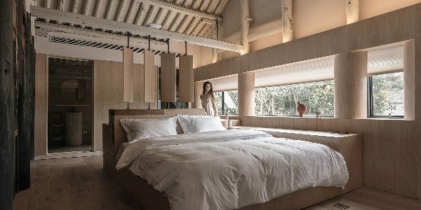 “注意”設(shè)計(jì)工作室將中國(guó)杭州的一座百年老建筑改造成了現(xiàn)代茶室和賓館。這座歷史悠久的住宅位于龍塢山的森林中,建于清朝時(shí)期,屬于徽派建筑。這種古老的傳統(tǒng)住宅建筑風(fēng)格大多使用磚、木梁和石頭,反映了該地區(qū)的山地特征。獨(dú)特的木質(zhì)框架,由“新月形”橫梁和“支架”構(gòu)成,為現(xiàn)代功能的附著提供了環(huán)境,并為房屋注入了新的生命。