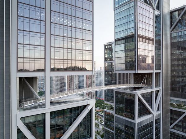福斯特建筑事務所將大疆的天空之城設計為深圳的“創(chuàng)新中心”。建筑師指出,在落腳于不對稱的懸空鋼結(jié)構(gòu)概念之前,提出了數(shù)百個設計迭代方案。兩座塔樓分別為44層和40層,并由一座精致的天橋連接。這兩座大樓很快將容納多達8000名員工,提供辦公空間、研發(fā)中心、無人機測試區(qū)和公共設施。大疆天空之城的集群體量達到了213米(700英尺)的高度,表明它是漂浮在城市環(huán)境之上的建筑作品。