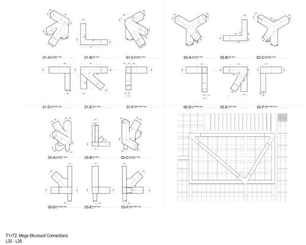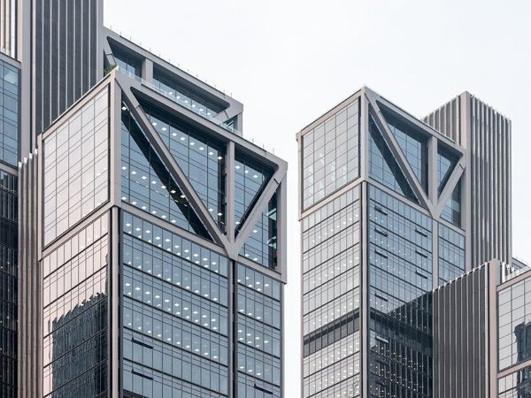 福斯特和合伙人事務所的團隊將兩座大疆的塔樓組織起來,每座塔樓都有一個中央核心,大體量的塔樓被懸挑起來。六塊玻璃從東西兩側(cè)不對稱地懸掛在核心區(qū)的三個側(cè)面。懸掛的玻璃磚由巨型桁架和鋼制懸掛管承載,這些懸掛管的四角與圓形截面相連,玻璃磚的最大懸空高度達到21.5米(70.5英尺)。該結(jié)構(gòu)系統(tǒng)既起到了承重作用,又暴露了美學元素,實現(xiàn)了空間、結(jié)構(gòu)和形式之間的高度統(tǒng)一。