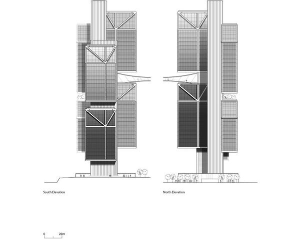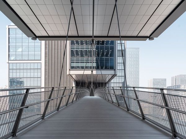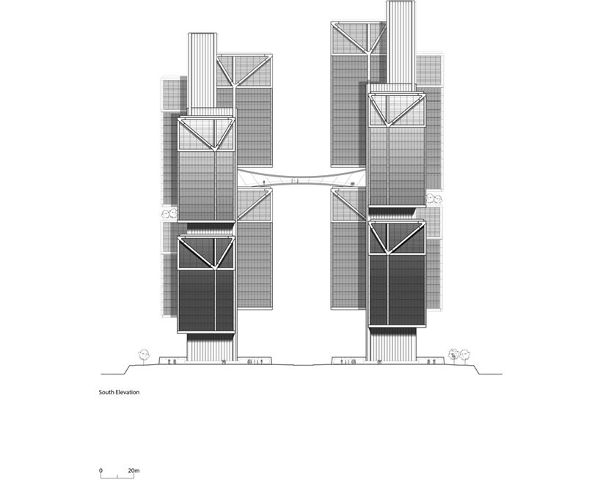 一座吊橋橫跨九十米(295英尺),在離地面105米(345英尺)的第24層連接兩座塔樓。天橋纖細輕盈,與大塊的體量相協(xié)調(diào),創(chuàng)造出“靈動的元素”。該項目的首席建筑師Young Chiu評論說。天空之城的體量和結(jié)構(gòu)是誠實和暴露的,從內(nèi)部和外部都有豐富的表達。它的美是簡約而溫暖,安靜而挺拔,不加修飾,簡單而樸素“。
