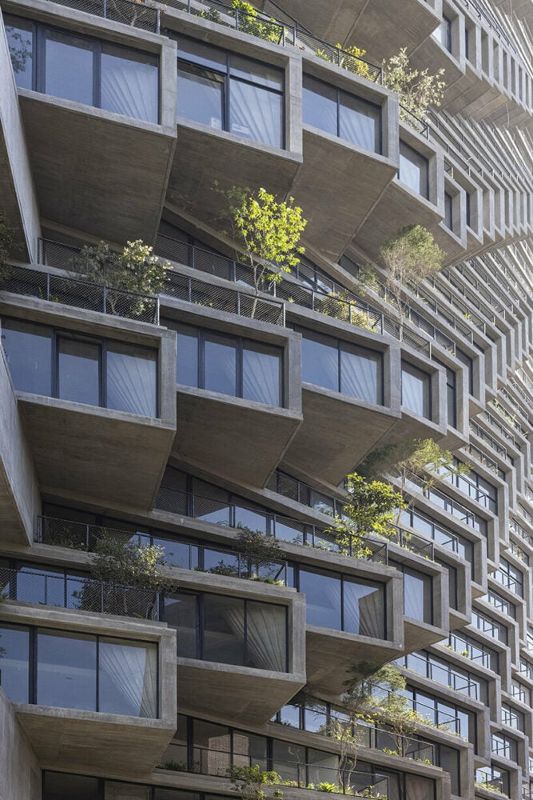 該團隊描述了該項目的建筑特征,“剝落”的原始、裸露的混凝土外墻。既是建筑的結構,也是容易識別的特征。獨立的“方塊像素”被堆疊在32層樓高,并加以旋轉,以提供最佳的視野,同時為公寓創造露臺。采用了當地的樹木和植物,該建筑也盡可能地整合了綠色植物,以利用厄瓜多爾的溫帶氣候和生態環境;厄瓜多爾是世界上單位面積擁有最多植物物種的國家。