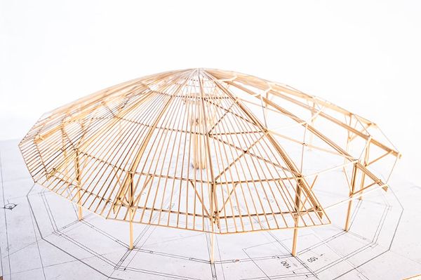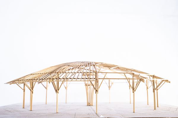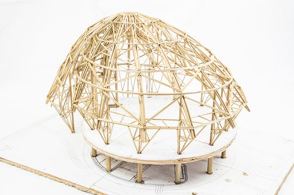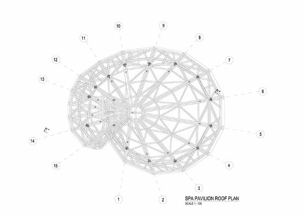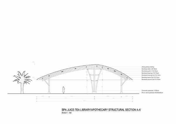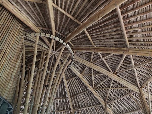 建筑群遵循由十四根柱子組成的計劃,這些柱子由耦合的桿子制成,并用傾斜的支撐物加固,在中央竹塔的幫助下減輕屋頂?shù)闹亓俊?屋頂結(jié)構(gòu)由十四根由三根桿組成的梁組成,徑向放置在垂直支架上。 五階線性檁條形成屋頂?shù)膱A形形狀,并為最后一層椽子提供支撐。 竹子交叉系統(tǒng)加固了結(jié)構(gòu),而懸掛在排水溝線上的天然印度尼西亞茅草“alang-alang”提供了遮陽避雨的保護,并形成了天篷的最終外觀。
