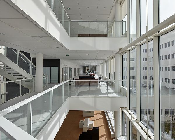 Groupe-6設計的研究區位于中庭的東面,沿Rue de la Recherche設有最先進的實驗室、研究人員的工作空間和愉快的會議場所。設計中特意使用了一些簡單的元素,如玻璃、光線和白色的表面,與之形成對比的是使用了穿孔吸音OSB木板,利用可持續的低成本材料創造出視覺上的溫暖氛圍。該建筑群通過地熱井與大學的能源網相連,并獲得了符合法國綠色建筑高質量環境標準的認證,具有很高的能源效率。