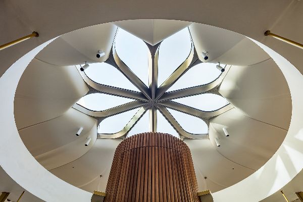 最后,溫斯頓-丘吉爾(Winston Churchill)和T.E Lawrence(又名阿拉伯的勞倫斯)每天上班時曾經走過的庭院鵝卵石被精心保留下來,并重新鋪設成現代圖案,與咖啡吧閃閃發光的花瓣式屋頂相呼應。荷蘭的Octatube公司與建筑公司合作設計了展館結構,并與總部位于倫敦的奧雅納公司共同提供了工程、聲學、照明和可持續發展方面的專業知識。