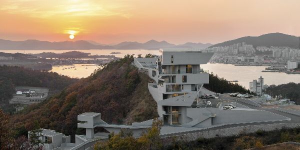 由IDMM建筑事務(wù)所設(shè)計的“港口堡壘”位于韓國多爾山島白草吉的高原上。該建筑位于海拔100米的高山上,占地面積9936平方米,從自然景觀中脫穎而出。向西北方眺望,麗水市優(yōu)雅地環(huán)繞著鐘吾山、瑪拉伊山和風(fēng)景優(yōu)美的座山公園,勾勒出一幅如詩如畫的海岸全景圖。西南方向的城市天際線與瀨久治村和南海形成迷人的對比。