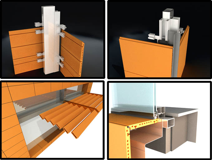 本項目幕墻工程主要包括斷橋隔熱拉栓式明框玻璃幕墻系統、可調懸臂式陶土板系統、陶棍式遮陽百葉系統、無膠縫式鋁單板系統、隱框鋁合金窗系統等工程。