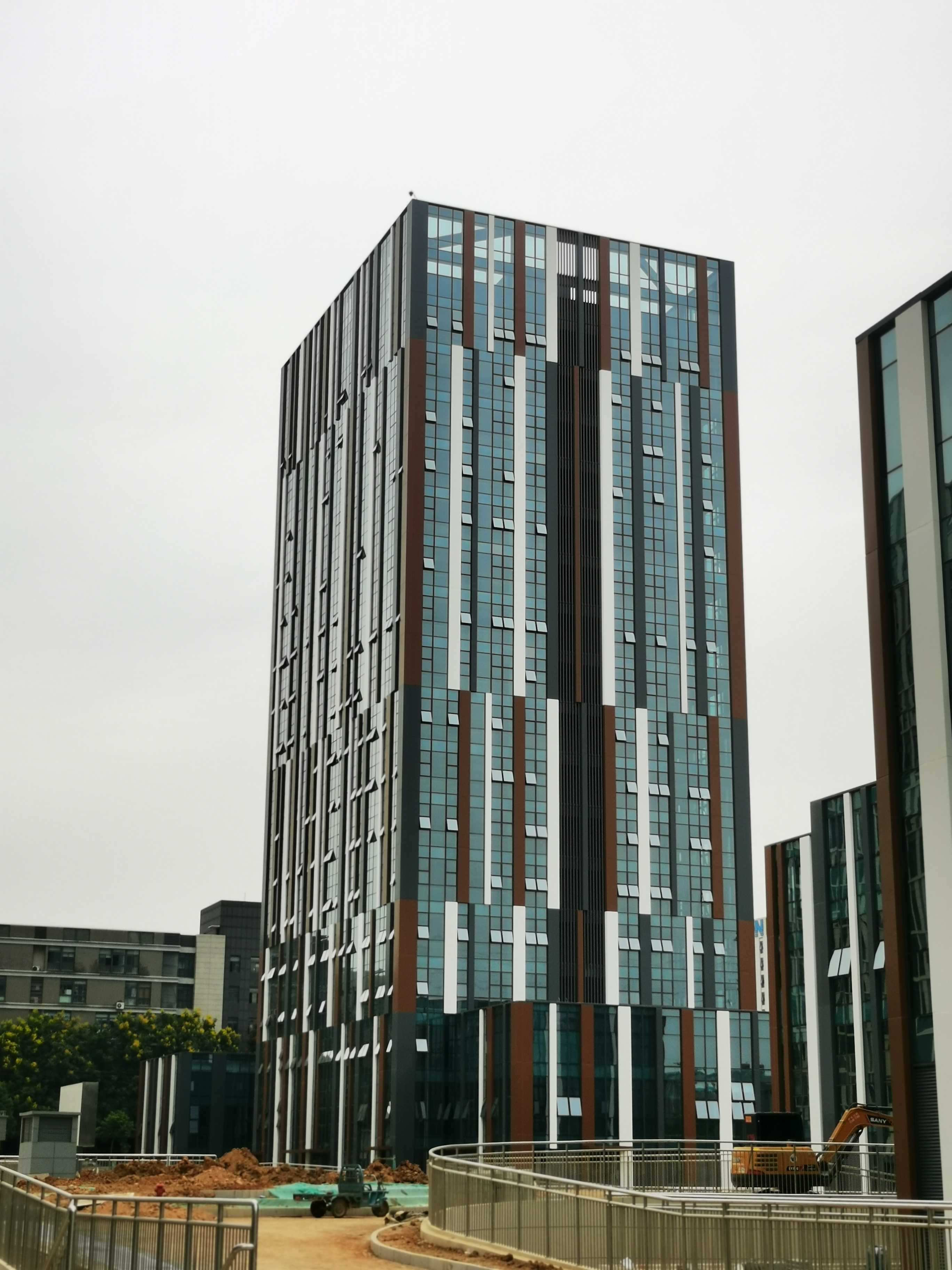本工程包括1#樓、2#樓和6#樓,建筑功能均為新型廠房。本工程主要幕墻系統(tǒng)形式為豎明橫隱玻璃幕墻、鋁合金格柵、蜂窩鋁板幕墻、玻璃雨蓬和鋁板雨蓬。本工程采用新材料-玉玻璃,為工程添色不少。我院幕墻事業(yè)部針對本工程特設(shè)計了裝飾邊框一體化豎明橫隱玻璃幕墻系統(tǒng),減小裝飾條的截面,突出鋁板造型效果。