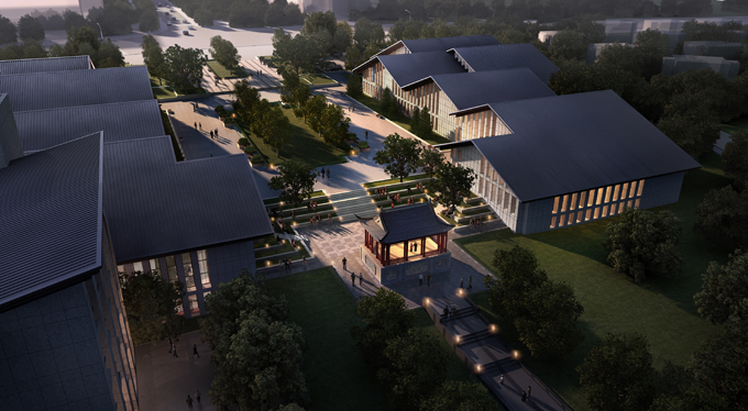 項目位于湖北黃梅小池濱江新區,場地緊鄰城市干道冬青路,處于水月路延伸的城市軸線上。項目充分順應城市軸線,創造連接城區和景觀湖的景觀軸線。同時建筑上將酒店和文化展示中心分設地塊兩側,沿軸線設置景觀節點。建筑造型上我們以黃梅戲這一民俗文化為核心提煉元素,抽取傳統聚落建筑的印象片段,運用現代手法進行營造。我們同時充分設置公共綠地,與城市共享景觀,優化城市界面也服務于社會。