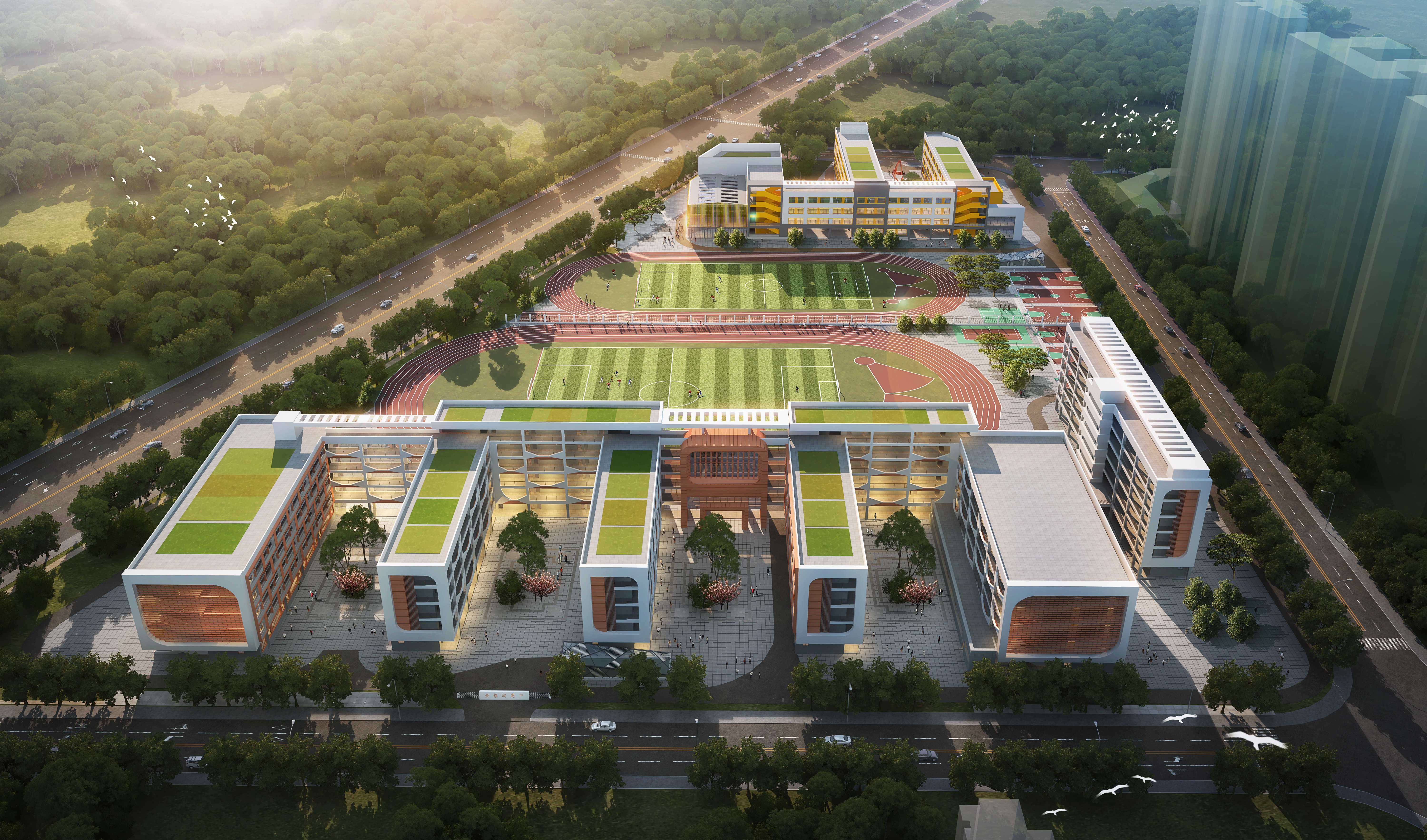 本項目新增建筑面積38500平方米,新增建筑占地面積16625平方米,其中:(1)3#學生公寓10000平方米;(2)食堂3000平方米;(3)學生浴室1000平方米;(4)綜合樓4500平方米;(5)風雨操場3000平方米;(6)體育館6000平方米;(7)圖書館6000平方米;(8)教學樓5000平方米等內(nèi)容;并新增相關教學設備。工程院設計團隊充分考慮該地塊的地形與周邊現(xiàn)狀情況,努力實現(xiàn)校園內(nèi)功能布局合理、緊湊;交通流線方便、快捷。在滿足規(guī)劃要求的前提下,為學生提供一個“陽光、健康、綠色、舒適”的校園環(huán)境。